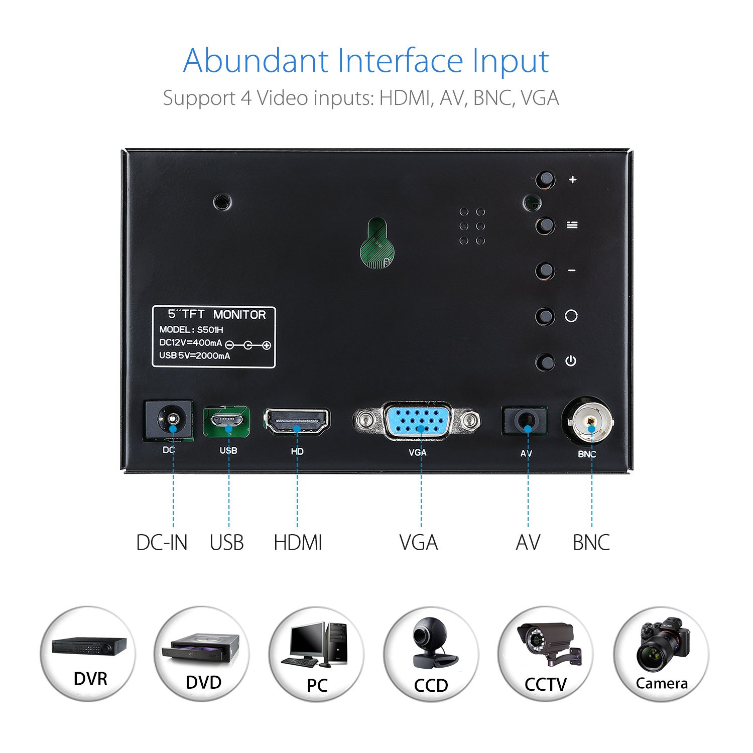 The Eyoyo mini HDMI multi-port monitor, provide Professional factory color calibrated Native resolution HD 800 * 480 high resolution Precise Color. It supports VGA, HDMI, BNC and AV inputs so you can easily extend the enjoyment from many devices on Full HD display. what's more, this monitor supports USB charge and 12V DC power supply charge.