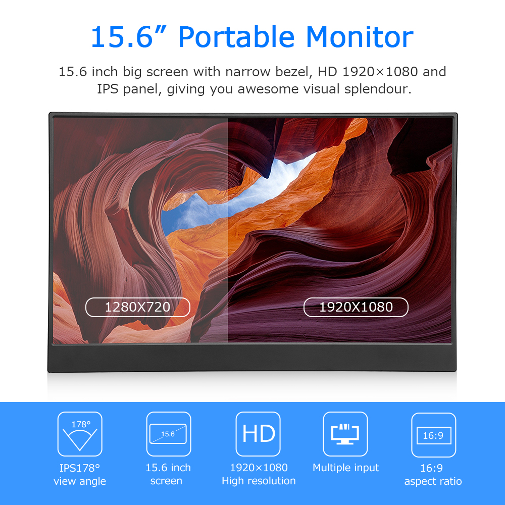 1.EYOYO 15.6 inches portable monitor : 15.6 inches big screen with 1920x1080 high resolution, HDR view optimization, NTSC 72% gamut and IPS 178° view angle, presenting a more colorful and exquisite view with more details of light and shade, contrast and hierarchy could also been enhanced. Giving a more brilliant visual impact to you during gaming.