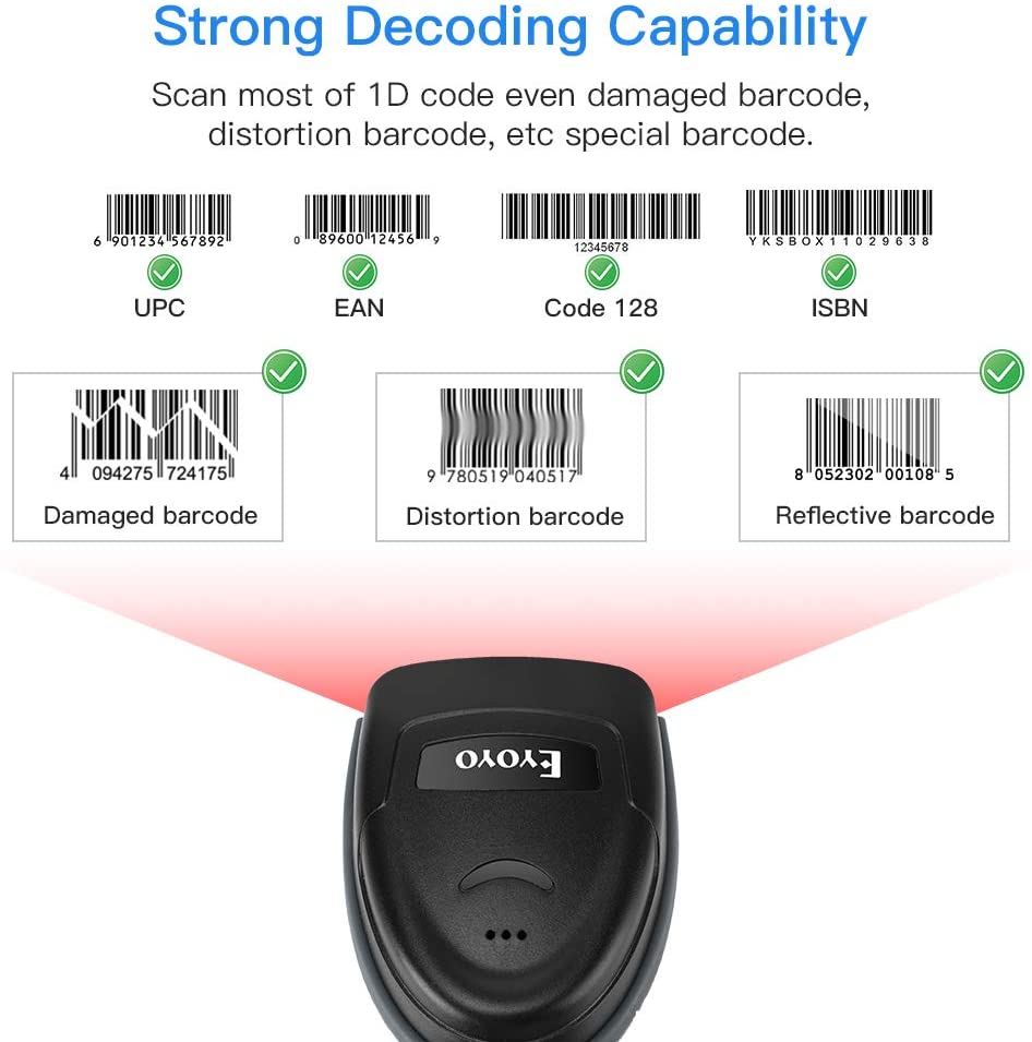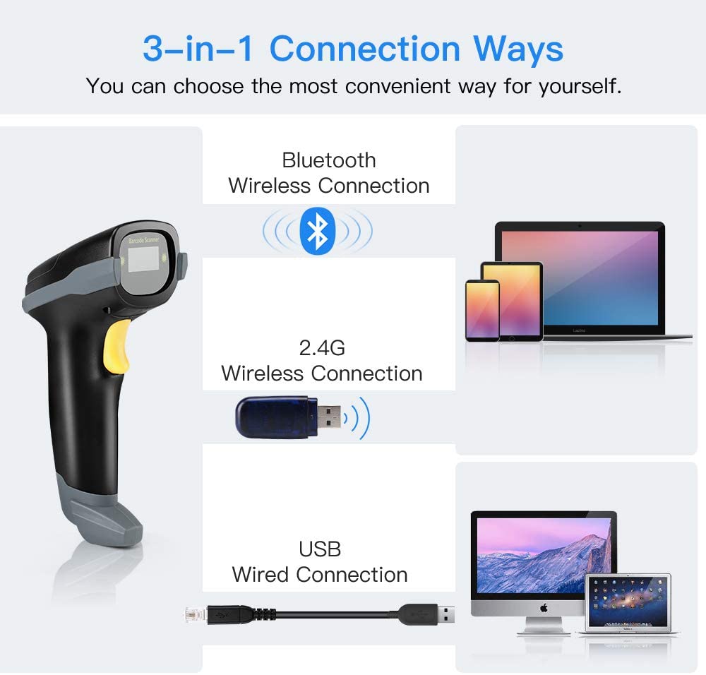 Eyoyo EY-018 1D Bluetooth Barcode Scanner Wireless,USB Wired/Bluetooth/ 2.4G Wireless Connection Hand Scanners with Time & Date Prefix Suffix USB Bar Code Reader for Inventory Management