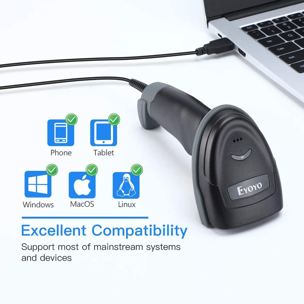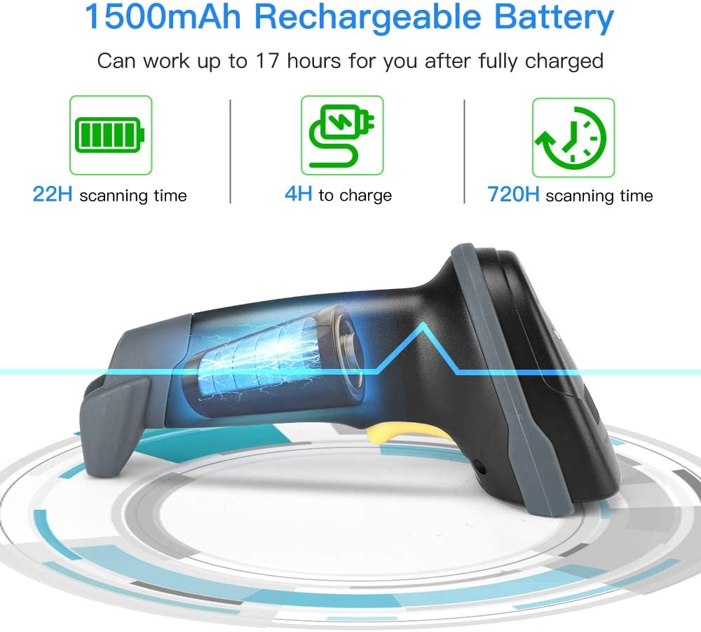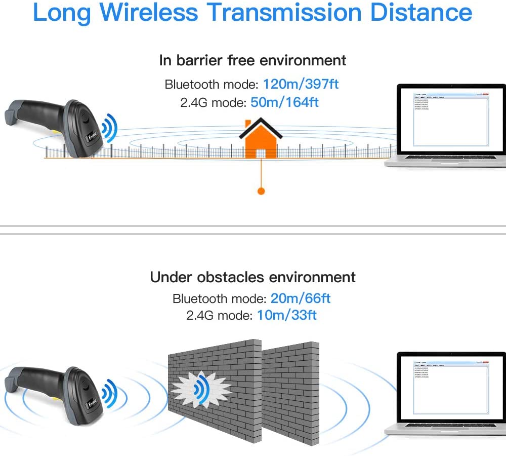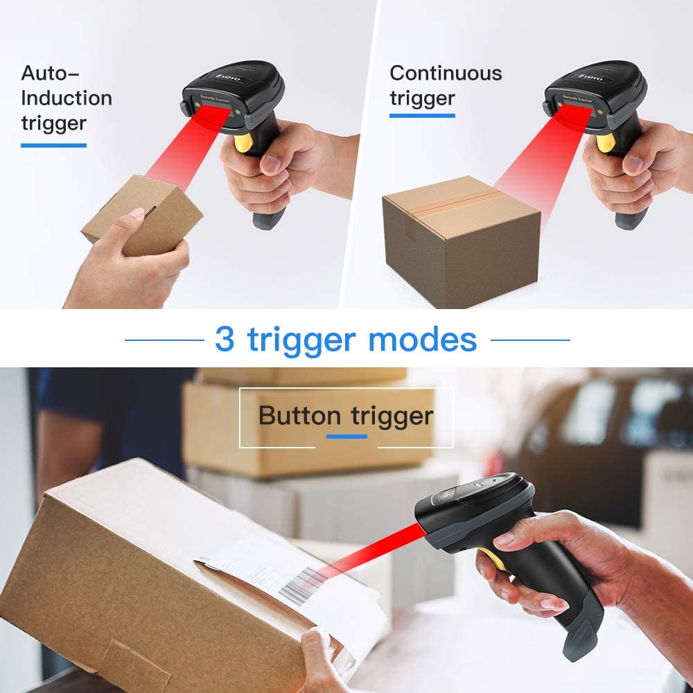 Eyoyo EY-018 New Handheld barcode scanner with Time & Date Prefix Suffix.It supports auto-sensing scanning and continuous scanning. it is a 3-In-1 USB wired & Bluetooth & 2.4GHz Dongle Wireless Barcode Scanner